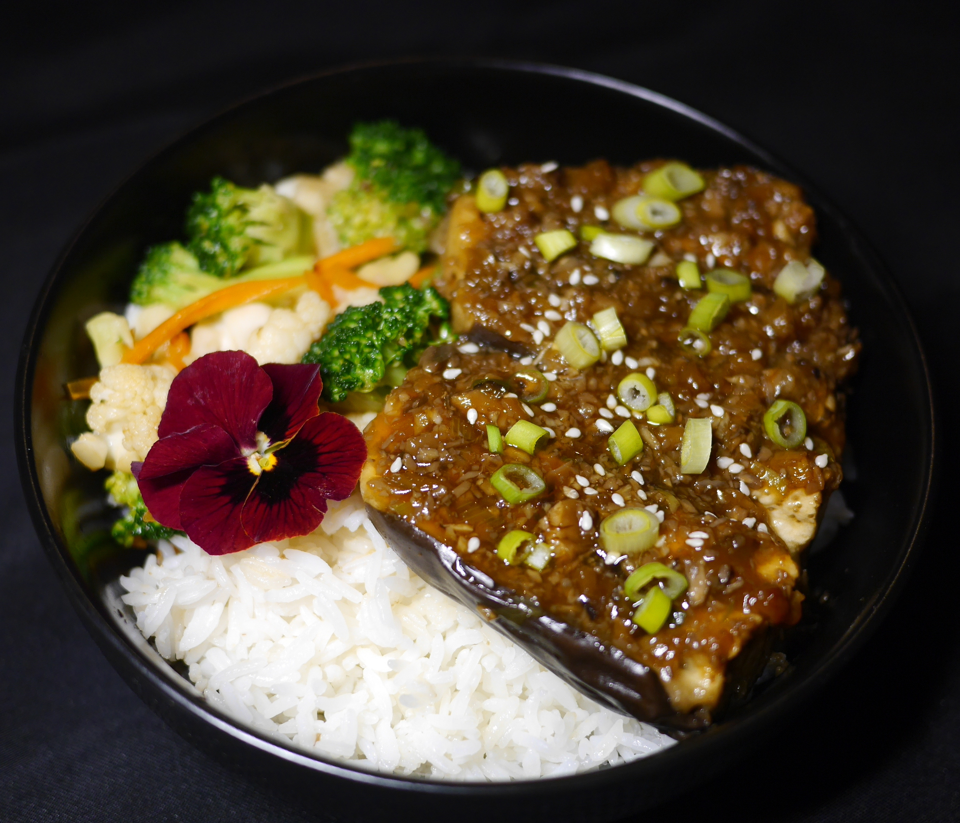 Un plat végétalien - Aubergines cuites à la vapeur accompagnées d'une sauce avec trois types de champignons, dans la recherche d'un équilibre entre sucré et salé.