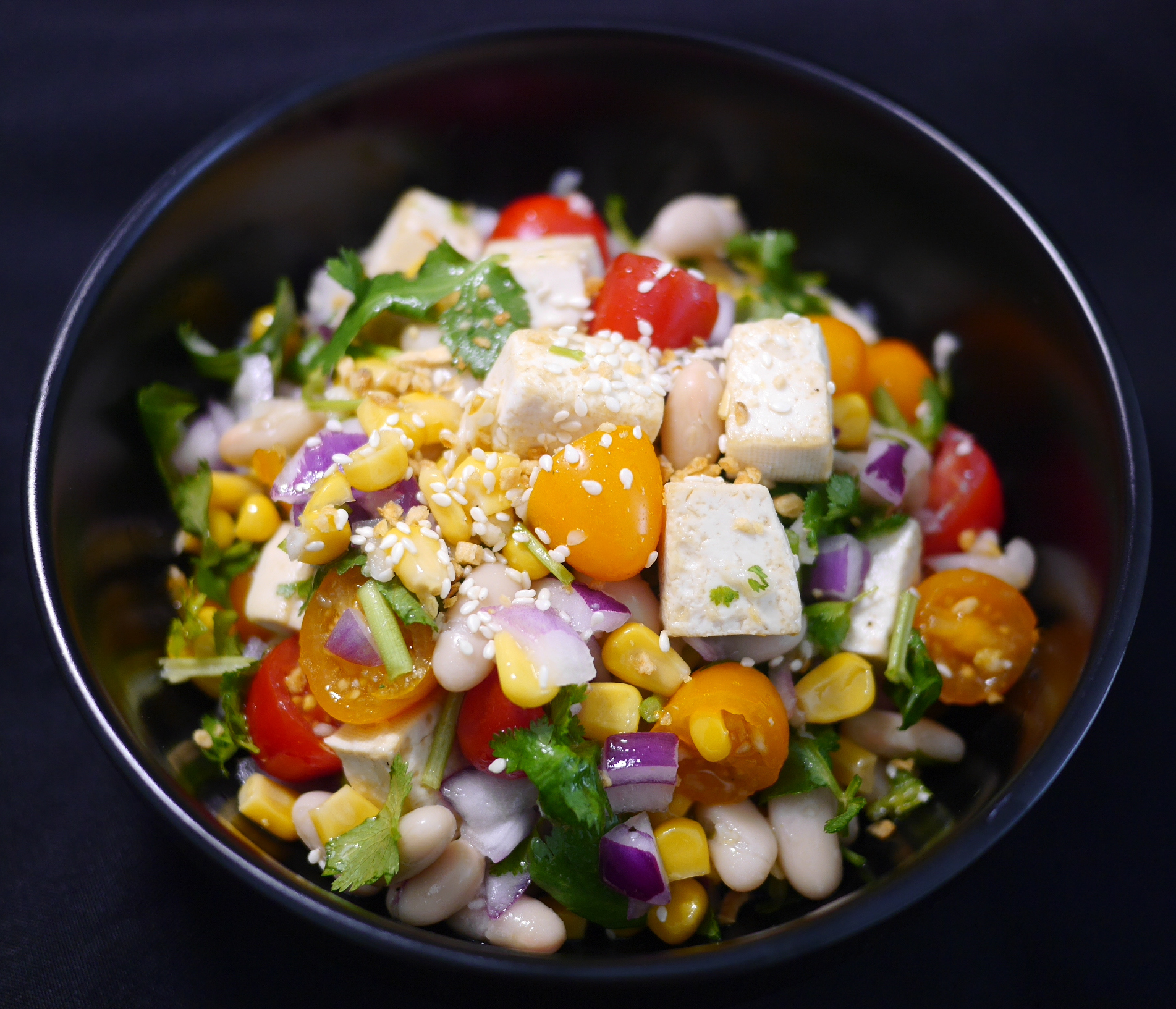 Un bol végétalien - Haricot blanc, maïs, tofu frit, tomates cerises, oignon rouge et coriandre, avec une sauce au citron et à l'ail. Une salade protéinée pour faire le plein d'énergie en été.