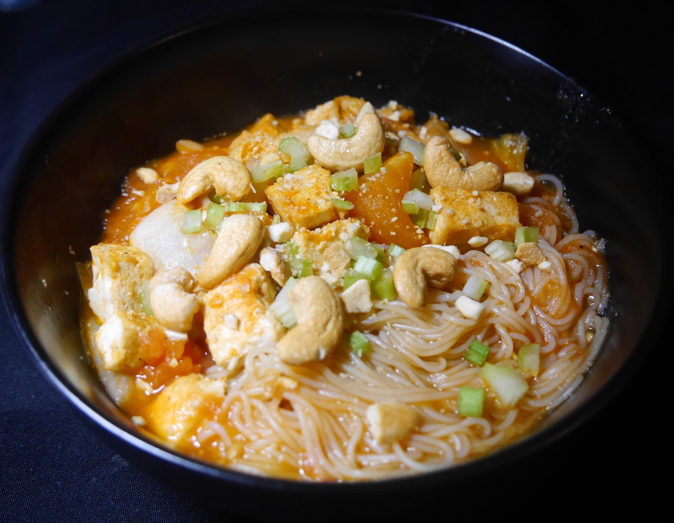 Base de vermicelles de riz, avec une soupe de tofu frit, champignons et tomates, saupoudré de celeri et noix de cajou, un plat chaud et réconfortant.