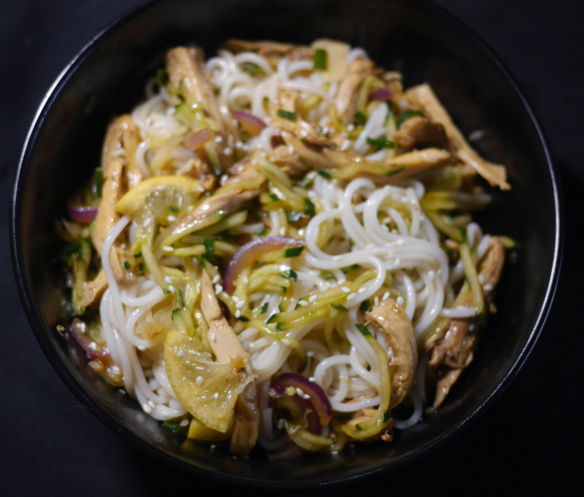 Poulet désossé à la main - Cuisse de poulet éffilochée, pour mieux absorber la sauce au citron, accompagné de vermicelles au riz et de concombres pour un goût rafraîchissant.